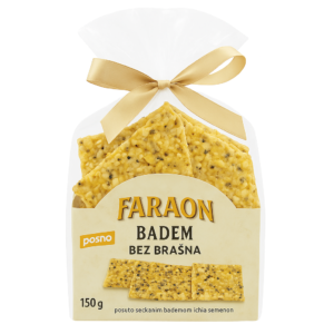 Faraon badem kreker je nastao iz potrebe za grickalicom koja je niskokalorična, nema brašna, nema šećera, nema aditiva. Pogodan je u antikandida dijeti, za dijabetičare i za sve koji vode računa o zdravlju i izgledu. 70% sastava čine mlevene leblebije.
